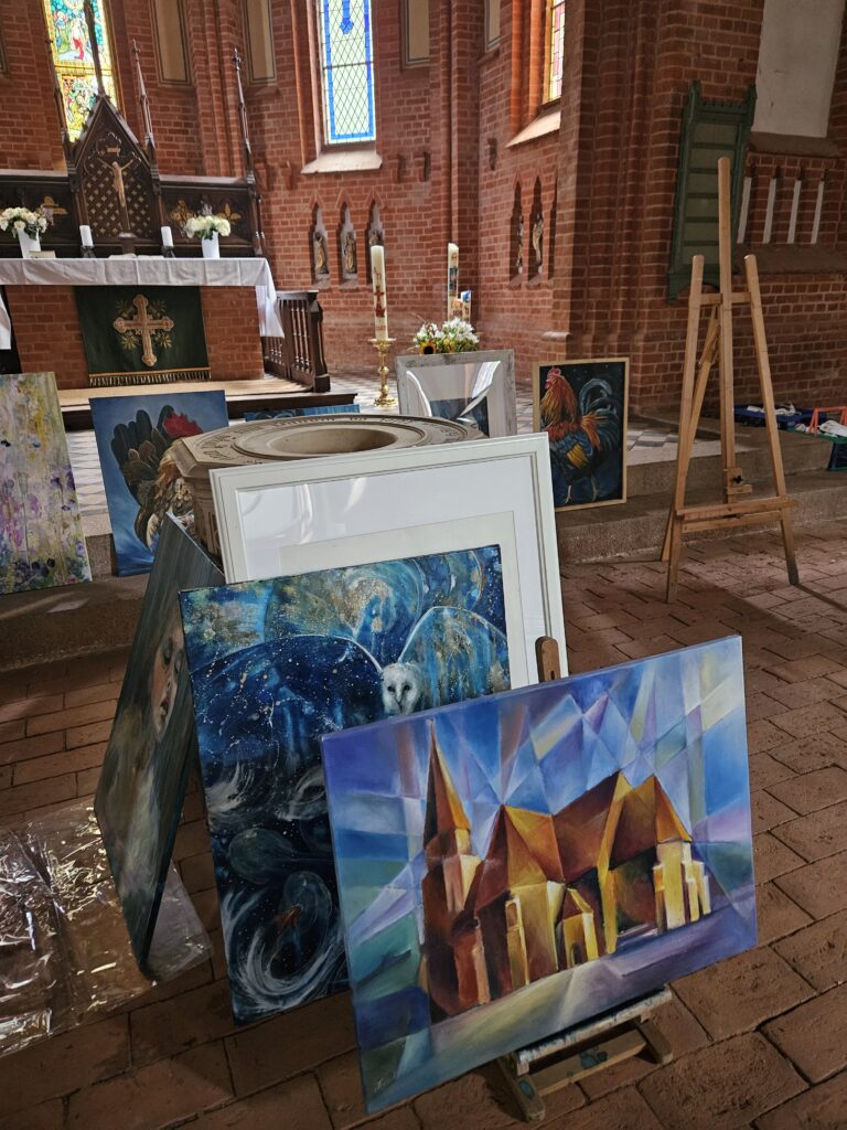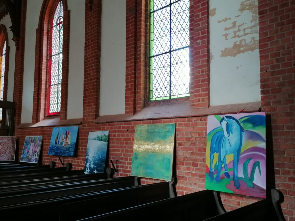 Vier Künstlerinnen und Künstler – Heike Finck, Tobias Hofmann, Siobhan Fitzgerald-Clark und Zsolt Nemeth – präsentierten im Innenraum der denkmalgeschützten Kirche rund 40 Werke ihres vielfältigen Schaffens. Porträts, Stillleben, Fantasie- und Landschaftsbilder schmückten das Gotteshaus und gaben ihm für einen Nachmittag eine völlig neue, bezaubernde Atmosphäre.